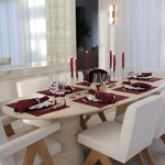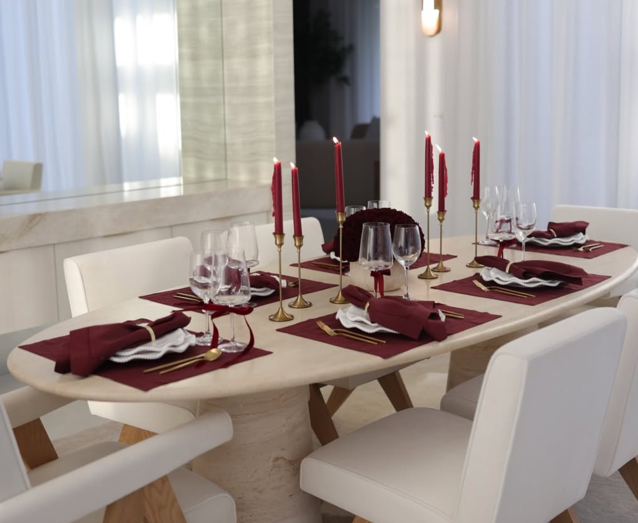 Shown here in Italian Travertine and Calacatta Tara Marble, this dining table design celebrates the natural warmth and variation of stone, transforming dining into an experience of refined beauty.