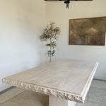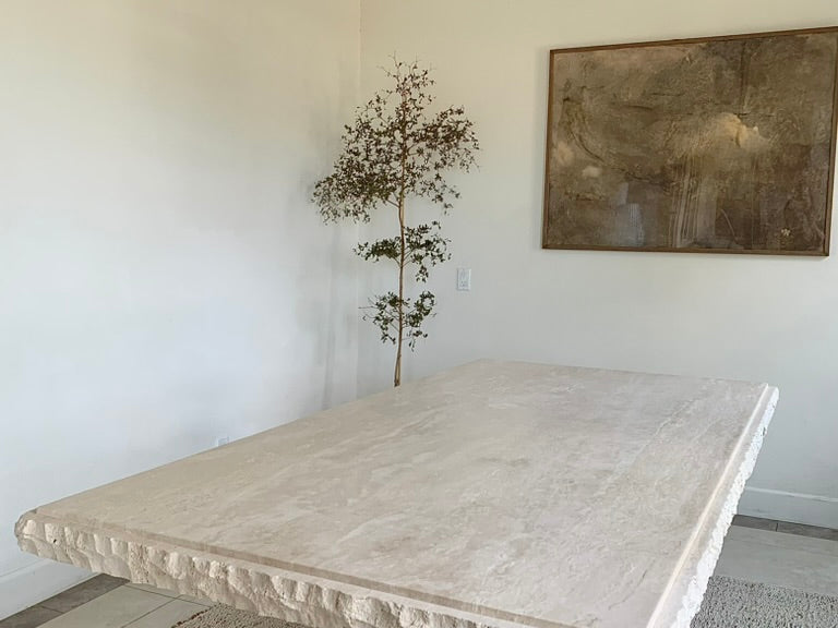 The TERRA Table form draws influence from vintage live-edge classics—celebrating the raw, organic beauty of stone. A hand-chiseled drop-down edge reveals the material’s natural texture, giving each piece a sculptural, grounded presence that honors the artistry and integrity of its origin.