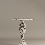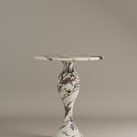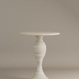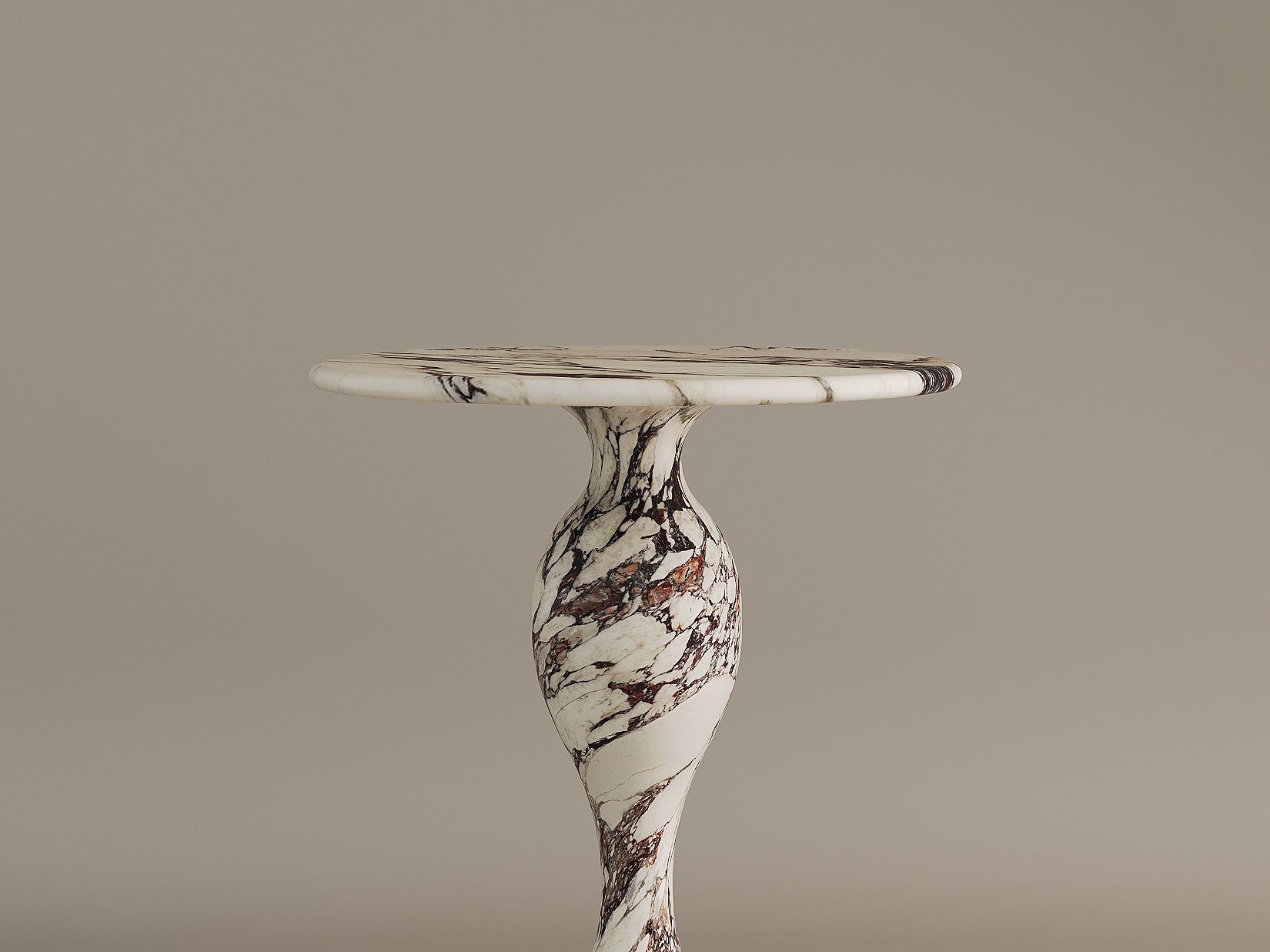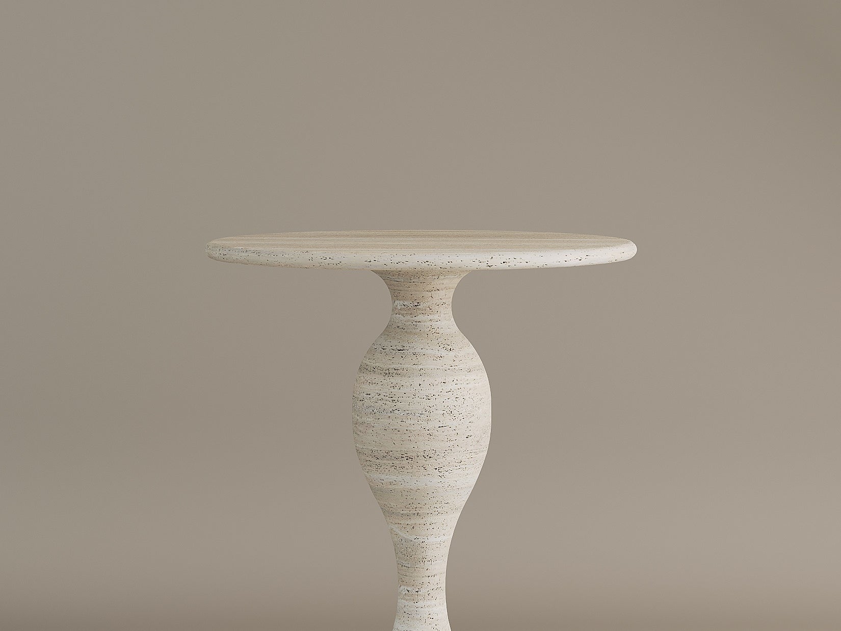 Carved from a single block of stone, VICENZA (20”D x 24”H) is shown here in Italian Calacatta Viola & Roman Travertine, celebrated for its rich, expressive veining that reveals nature’s own artistry.
